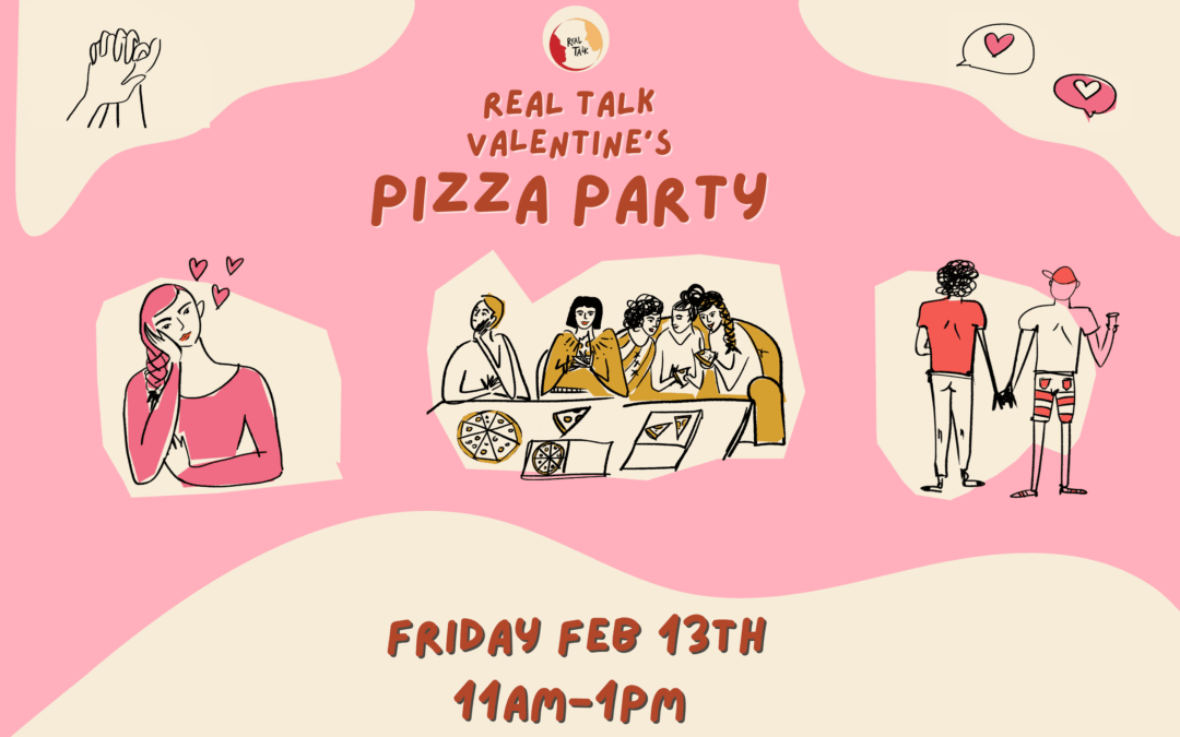 Come join Sexual Health Educators Hayley and Sharon, and Peer Facilitator Dan on Friday, February 13th from 11am – 1pm for an in-person Real Talk Classic Pizza Party.The event is free, and anyone with an intellectual disability is welcome to attend. If you want to bring a supporter or a friend with you – that’s totally fine! If you register in advance you will get an email reminder the day before the event. It’s also ok to just show up. Click here to find out more about how to prep for a Real Talk event, and feel free to email john@real-talk.org if you have any questions.
